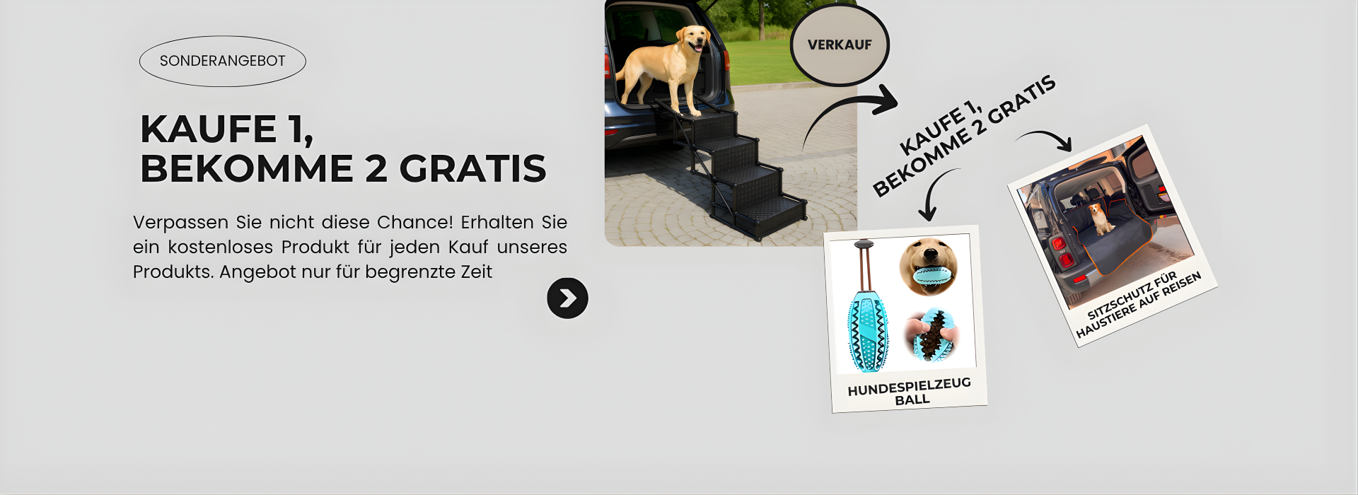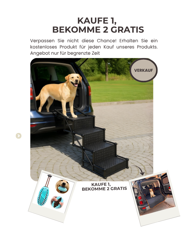 Dieses Angebot ist die perfekte Gelegenheit, deinem Hund etwas Gutes zu tun und gleichzeitig von einem unglaublichen Deal zu profitieren. Sichere dir jetzt die Hundetreppe, den Hundespielzeug Ball oder den Sitzschutz – oder alle drei – und genieße unsere Kaufe 1, Erhalte 2 Gratis-Aktion!